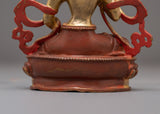 This handcrafted Sacred Sculpture of Vajrasattva is a small yet powerful work of art, measuring 15 cm by 11.5 cm and weighing 0.55 kg. Made of copper, the sculpture features acrylic colors that highlight the features, while the gold-plated finish adds a radiant and refined appearance. The design is enhanced with artificial stones, such as coral and turquoise, which symbolize protection, healing, and knowledge.