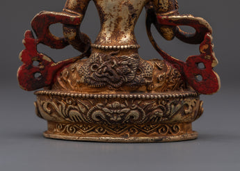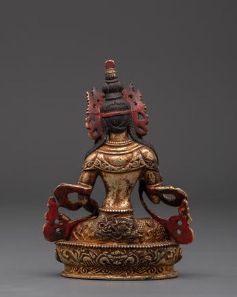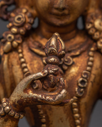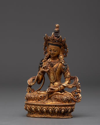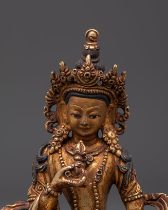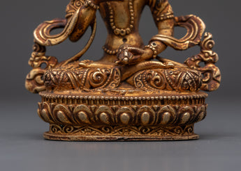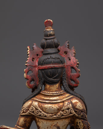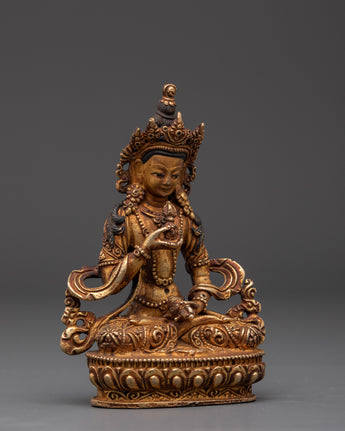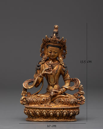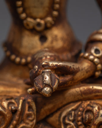 This Seated Vajrasattva Statue, crafted from copper and electro gold-plated, embodies purity and spiritual transformation in Tibetan Buddhism. Meticulously detailed, this meditation sculpture serves as a powerful tool for cleansing negative energies and enhancing inner peace.