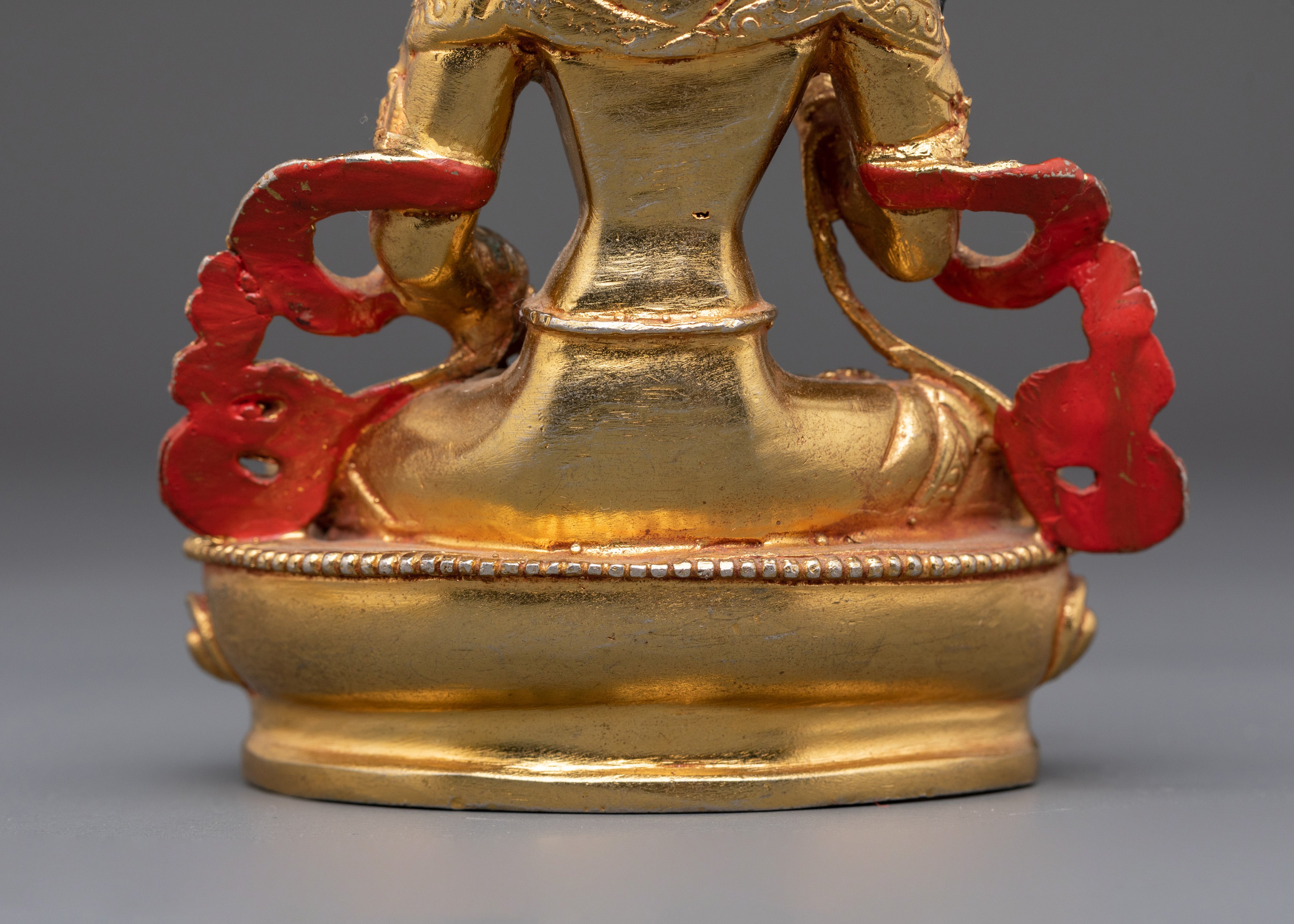 A powerful depiction of Vajrasattva, the Buddha of purification, this Tibetan gold-plated statue represents the elimination of negative energies and impediments on the way to enlightenment. The statue, which is 14 cm tall and made of copper with a gold plating finish, depicts Vajrasattva sitting peacefully while holding a vajra and bell, which stand for the union of compassion and knowledge. The elaborate details of his garments, his emotions, and the holy symbols all around him are accentuated by the vivid gold plating.