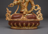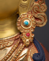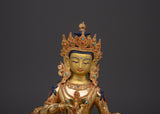 This wonderfully made Vajrasattva bodhisattva statue is 32 cm tall and 22.5 cm wide, and weighs 3.10 kg. It's made of copper and gold-plated, with exquisite adornments of imitation coral and turquoise stones. The statue sits on a beautifully sculpted lotus pedestal, which enhances its spiritual and religious presence. This piece's size and materials make it suitable for prominent altars or meditation spaces, acting as both a spiritual and artistic focal point.