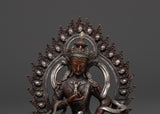 Vajrasattva is shown sitting in a tranquil contemplative position, holding the vajra (thunderbolt) in his right hand to signify invincible spiritual force, and the bell in his left to represent knowledge and emptiness. This image, adorned with an intricate crown and framed by a halo of silver flames, represents the unification of compassion and wisdom, both of which are essential to Vajrasattva's position as a purifier of negative karma and spiritual obstacles.