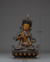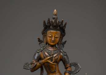 This beautiful Vajrasattva deity statue, 30.5 cm tall and 20 cm broad, is made of oxidized copper and depicts one of Tibetan Buddhism's most revered deities. Vajrasattva, also known as Dorje Sempa, represents purification and blesses practitioners by removing negative karma and transforming harmful emotions. His presence in your home is a powerful emblem of spiritual growth and awakening.