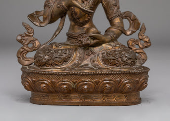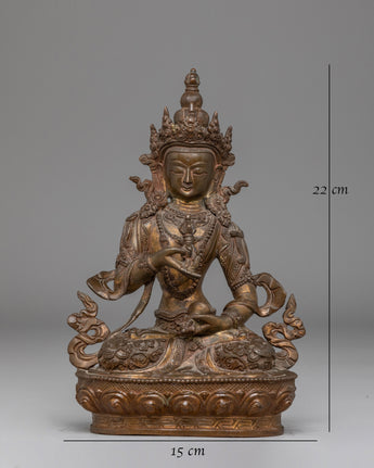This Vajrasattva Handcrafted Sacred Statue is crafted from a refined copper body with an antique finish, weighing 3.71 kg for a beautifully grounded presence in any spiritual space. Its detailed metalwork highlights the deity’s serene expression, elegant posture, and the symbolic implements he holds. The antique finish enhances the depth of every carving, bringing warmth and authenticity to this sacred piece of Buddhist art.