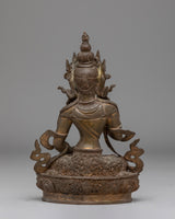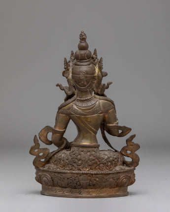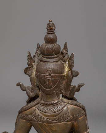 Intricate motifs can be seen throughout the statue, from the finely engraved robes to the meticulously shaped lotus seat and ornamental crown. Vajrasattva is depicted holding the vajra close to his heart, symbolizing purity and unshakable clarity, while the bell rests gracefully at his side, representing wisdom and compassionate awareness. The artisan’s craftsmanship offers rich texture, balanced contours, and spiritually meaningful detailing that elevate the statue into a true Himalayan masterpiece.