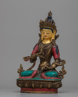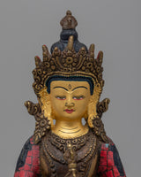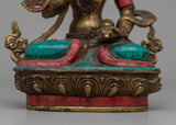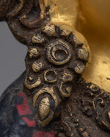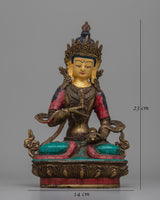 Carefully sculpted on a copper body and embellished with an electrogold plating, the Vajrasattva Practice Statue is a magnificent manifestation of purity and spiritual practice. This magnificent statue, which stands 23 cm tall and exudes a serene, graceful aura, beckons practitioners to go out on a path of purification and enlightenment.