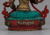 The statue exudes a sense of sacred beauty and heavenly energy due to its intricately placed inlaid turquoise and coral stones. These vivid stones create a harmonic fusion of colors that captivates the senses and uplifts the spirit, perfectly contrasting with the statue's golden luster.
