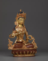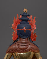 This Vajrasattva Buddha Statue is a finely sculpted portrayal of Tibetan Buddhism's purifying god. This sacred figure stands 31 cm tall, 22 cm wide, and weighs 3.11 kg. It has a copper body, beautiful gold plating, and intricate turquoise and coral inlay. Vajrasattva is revered in Vajrayana Buddhism as a spiritual purity and healing symbol. Practitioners seek his blessings to purify negative karma, remove defilements, and restore mental and spiritual clarity. This Vajrasattva statue serves as both a spiritual tool and an elaborate work of art, making it ideal for personal shrines, meditation spaces, or as a precious gift. It brings the energy of renewal, forgiveness, and spiritual clarity into any environment, promoting a profound journey to enlightenment and inner serenity.
