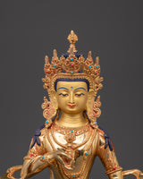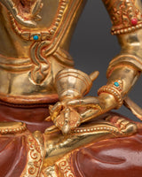The statue is forged from copper, gold-plated, and intricately hand-painted with acrylic colors, highlighting Vajrasattva’s serene expression and sacred ornaments. Holding the vajra and bell, he embodies the union of wisdom and compassion. This piece showcases the exceptional craftsmanship of Himalayan artisans. It serves as a beautiful spiritual centerpiece for those devoted to mantra practice, particularly the 100-syllable Vajrasattva mantra, renowned for its purifying power.