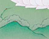 A Bodhisattva Vajrasattva artwork is meticulously hand-painted on cotton canvas utilizing vibrant acrylic colors and accented with 24K gold. The durable cotton provides a soft and smooth surface that elegantly showcases intricate details. The vivid colors animate Vajrasattva’s form, emphasizing his energetic presence. At the same time, the use of gold highlights key elements such as his crown, jewelry, and aura, giving off a gentle, spiritual shine. Gold symbolizes sanctity and highlights the traditional Karma Gadri style, known for elegance, refined proportions, and balanced harmony.