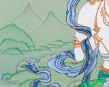 Vajrasattva, the Bodhisattva of Purification, is celebrated for his power to clear karma and mental impurities. Usually depicted in a serene, meditative stance, he holds a vajra (a symbol of the thunderbolt) in his right hand and a bell in his left, symbolizing the harmony of wisdom and compassion. In this thangka, he sits serenely on a lotus throne with a tranquil, focused expression that emanates clarity, kindness, and spiritual purity. The background draws from Buddhist teachings, highlighting his crucial role in purification practices, especially in Vajrayana rituals, where practitioners invoke him to remove negative karma. Every element and symbol in this artwork is meticulously crafted, making it a meaningful piece for devotion, meditation, and spiritual growth.