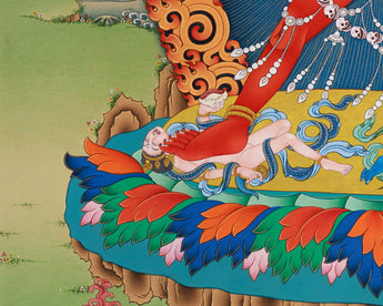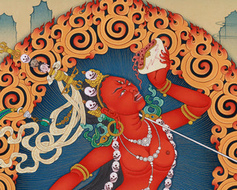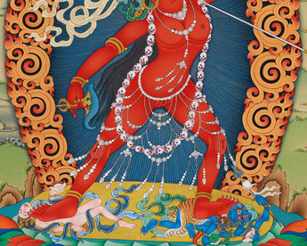 The Vajrayogini Thangka Print, presented as Traditional Dakini Canvas Art, embodies the essence of the sacred feminine within Tibetan Buddhist tradition. Vajrayogini, revered as a Tantric deity, represents the embodiment of wisdom, compassion, and enlightened energy. Crafted with meticulous detail and reverence for tradition, this Thangka print captures Vajrayogini's graceful form, adorned with symbolic attributes and surrounded by vibrant mandalas. As a symbol of spiritual transformation and liberation, Vajrayogini guides practitioners on the path to enlightenment with her fierce yet compassionate presence. Displaying this traditional artwork in homes or meditation spaces serves as a powerful reminder of the transformative power of the divine feminine and the boundless potential for spiritual growth and realization.