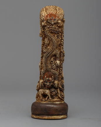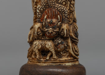 The Vajrayogini Bone Stamp, expertly created from ethically sourced yak bone, features an elaborate carving of the respected goddess Vajrayogini. Vajrayogini symbolizes tremendous spiritual significance in Tibetan Buddhism, representing wisdom, compassion, and the transformative power of enlightenment. Each aspect of the stamp demonstrates divine craftsmanship and devotion, beckoning practitioners to connect with the holy energy and wisdom it represents.