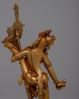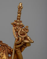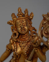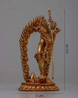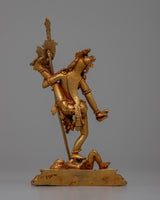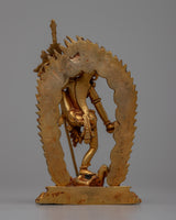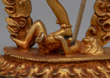 Vajrayogini is portrayed in her dynamic and passionate form. She is well-known for her potent and transformative energy. While the 24K gold plating adds a layer of richness and reverence, fitting her spiritual significance, the base material, copper, is used to ensure durability. Due to its size and weight, the statue is perfect for use as a focal point during meditation or as a personal altar.