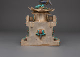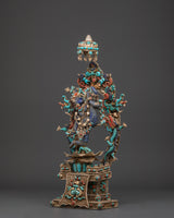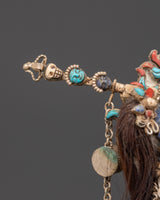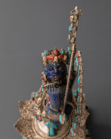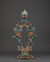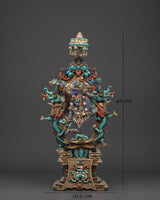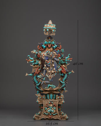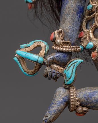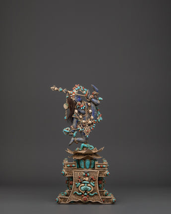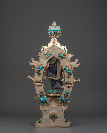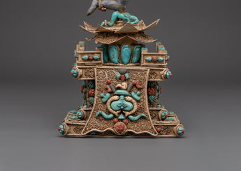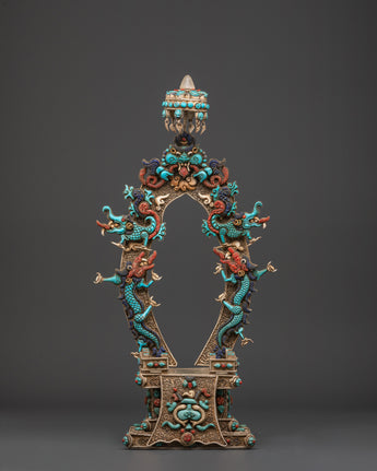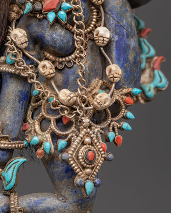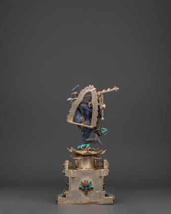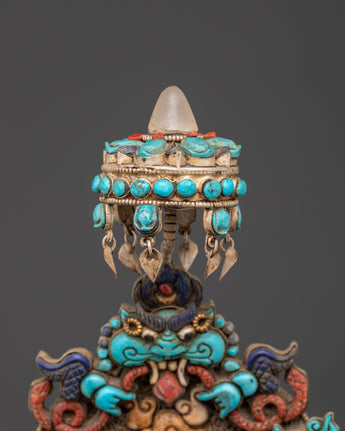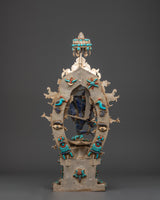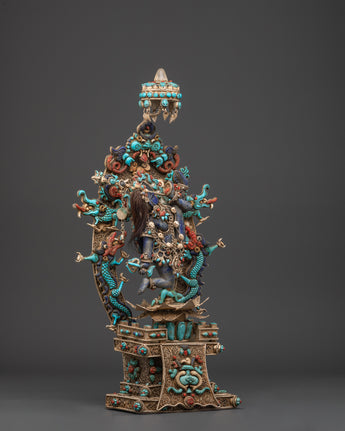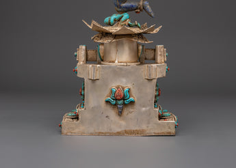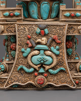 This Tibetan Vajrayogini statue is meticulously carved from copper and coated with a layer of silver plating, resulting in a brilliant, ethereal appearance. The artist has carefully embedded turquoise, lapis lazuli, and coral stones, which are historically thought to improve spiritual focus, protection, and energy. The rich features, from her angry expression to the wonderfully made dragon torana behind her, demonstrate outstanding Himalayan craftsmanship. This piece functions not only as a visual centerpiece but also as a sacred tool for ritual and tantric meditation activities.