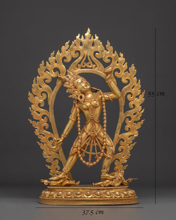 This Handcrafted Vajrayogini Golden Statue is a magnificent spiritual artifact, expertly crafted from copper and 24K gold-plated, showcasing the divine beauty and strength of Vajrayogini. Standing at 55cm tall and 37.5cm wide, this statue is a striking piece of Tibetan Buddhist art that embodies the essence of wisdom, transformation, and spiritual enlightenment. The fine craftsmanship and golden finish highlight the intricate detailing of the goddess's graceful posture and potent symbolism.