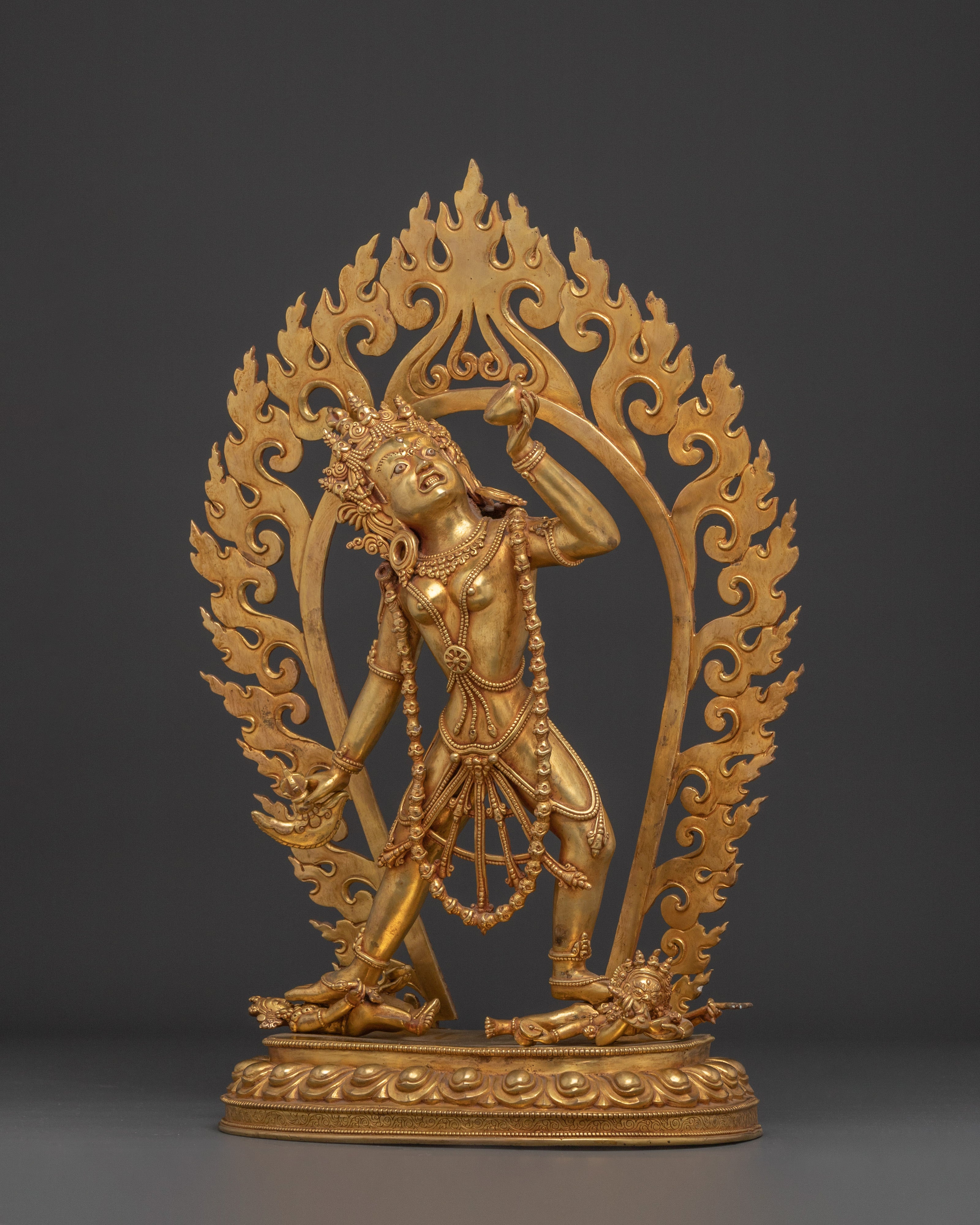 The design of this Vajrayogini statue reflects her role as a female deity in Tibetan Buddhism, symbolizing feminine strength, compassion, and the transformative power of wisdom. The statue's elaborate flame-like aura represents the fierce energy and liberating wisdom that Vajrayogini embodies. The delicate jewelry, intricate chains, and ornamental details exemplify the divine richness and spiritual significance of the goddess, making this statue perfect for any Buddhist altar or spiritual setting.