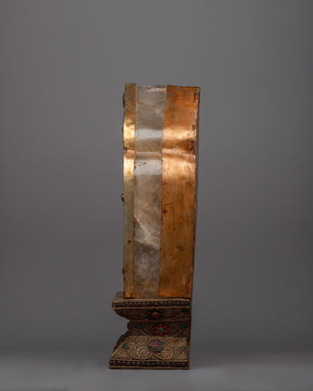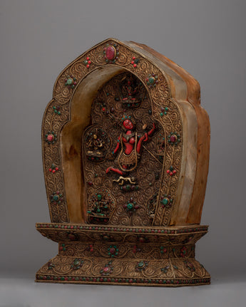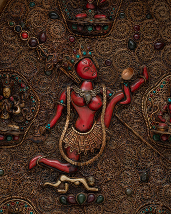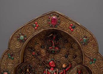 A well-known figure in Tibetan Buddhism, Vajrayogini stands for the difficult path to enlightenment and the conversion of ordinary experiences into spiritual knowledge. In addition to embodying these profound spiritual lessons, this statue is a gorgeous decorative item that lends a sense of solemnity to any setting. This statue is a remarkable addition to any location, whether it be a living room, meditation room, or a spot set apart for spiritual practice, because of its exquisite workmanship and the harmonic combination of silver plating and vibrant stones.