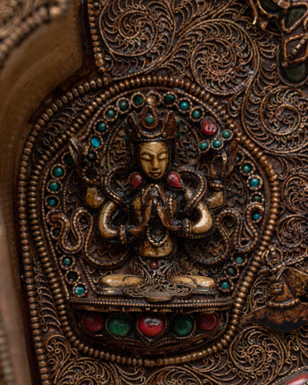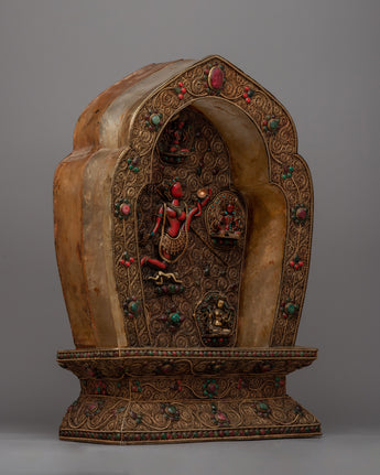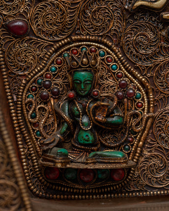 A masterwork of traditional craftsmanship, the Handmade Vajrayogini Statue has an exquisitely silver-plated copper body that has been carefully created. This statue, which represents spiritual metamorphosis, is embellished with various artificial and original stones, such as Panna, turquoise, coral, and crystal. The statue's overall beauty and significance are enhanced by the colorful and visually appealing design created by the artists' skillful and painstaking inlay work.
