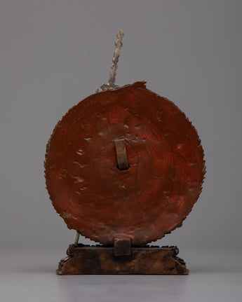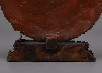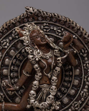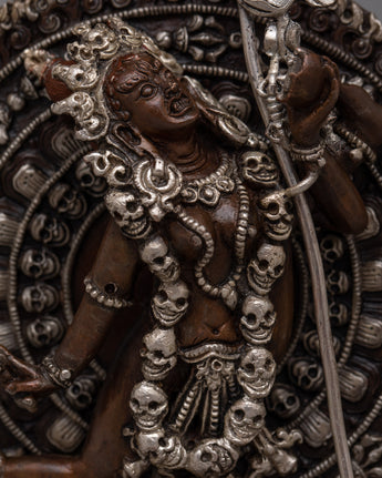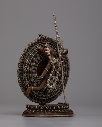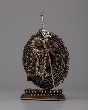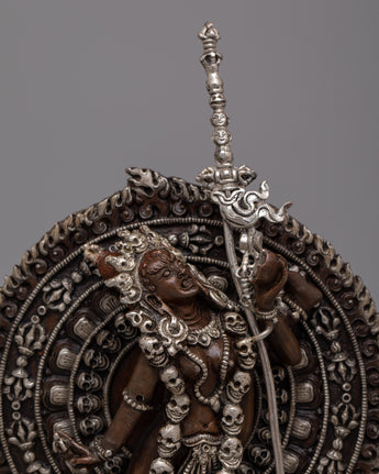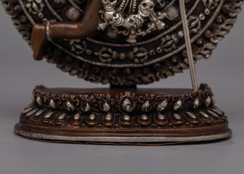 The Machine Made Dakini Vajrayogini Statue is a profound representation of Tibetan Buddhist spirituality. It is sculpted on an oxidized copper body with silver plating. Even though it weighs only 0.52 kg, it has a timeless elegance and a profound spiritual aura.