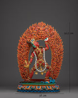 Introducing the Tibetan Dakini Vajrayogini Statue, a magnificent depiction of the Queen of the Dakinis, who is regarded in Tibetan Buddhism as the embodiment of change, knowledge, and freedom. Standing 56.5 cm tall, 38 cm wide, and weighing 8.30 kg, this strong statue is made of copper and brightly colored with acrylic paints, portraying Vajrayogini's fiery force and spiritual depth.