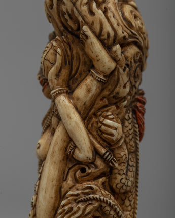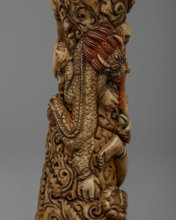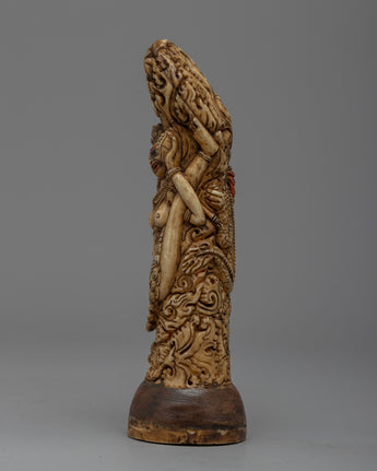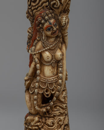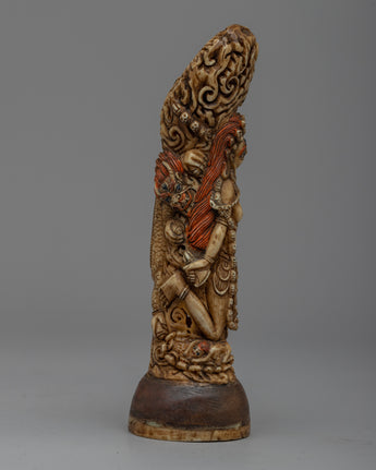 The Vajrayogini Tibetan Stamp is a one-of-a-kind and ethically crafted work of art. It is handcrafted on Yak bone sourced ethically and stands 15.5cm tall, making it a stunning addition to your collection.