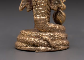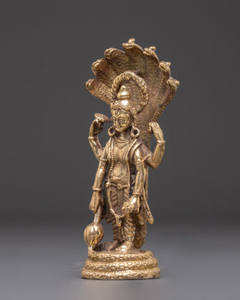 This statue is based on traditional portrayals seen in Hindu temples and art, with Vishnu's four limbs displayed in dynamic stances to highlight his active involvement in preserving cosmic equilibrium. The peacock-feathered crown and peaceful expression indicate the deity's wisdom, while the foundation on which the statue rests represents spiritual purity and heavenly beauty. The multi-headed serpent behind Vishnu is a traditional feature that represents the protection and power that Vishnu holds over both the divine and earthly realms.