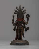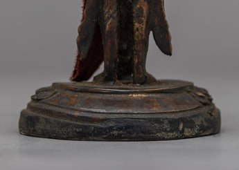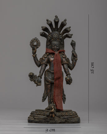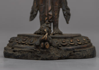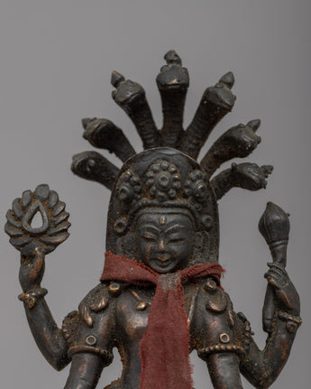 Introducing the exquisite Vishnu Bhagavan Statue, lovingly handcrafted on a brass body with a touch of antiquity. This remarkable statue captures the divine essence of Lord Vishnu, standing gracefully upon a lotus base, symbolizing purity and transcendence. The intricate craftsmanship brings forth the intricate details of the deity, showcasing his divine aura and majestic presence. The nags, intricately crafted upon the deity's head, symbolize protection and divine energy. With its antique finish, this Vishnu Bhagavan Statue exudes a timeless charm and serves as a captivating centerpiece for your sacred space or home decor. Allow the divine presence of Lord Vishnu to bring blessings, harmony, and spiritual serenity into your life.