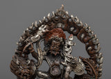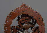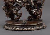Presenting the Machine Made ༀ Dzambhala Statue, which is finely plated in exquisite silver and has an oxidized copper body. This 9.5-cm-tall statue is of the Buddhist deity Dzambhala, who is admired for his capacity to draw wealth and fortune. In contrast to the dark, textured background of oxidized copper, the silver plating accentuates the fine details of Dzambhala's regal posture and symbolic qualities.