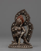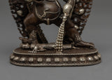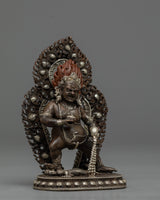 Presenting the Copper Black Dzambhala Statue, an exemplar of heavenly riches and grace. This statue, which is 11.5 cm tall and has an oxidized copper body, was precisely crafted and exuded spiritual significance and timeless elegance. This machine-made artwork, adorned with an electro-silver-plated finish, catches the eye of onlookers with its ethereal beauty as every detail gleams with luminous magnificence.