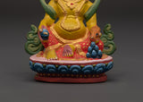 The statue's elaborately detailed design depicts Dzambala sitting in a royal position while clutching the jewel-spouting mongoose, a customary representation of unending prosperity. This item is a unique spiritual relic that attracts prosperity, abundance, and financial stability while radiating a serene aura due to the combination of traditional workmanship and spiritual symbolism. Whether put in your living area, office, or spiritual corner, this Tibetan fortune deity statue complements the ambiance with its divine aura and sacred meaning. For practitioners, spiritual searchers, or anybody else in need of blessings for prosperity and good fortune, it is a considerate present.
