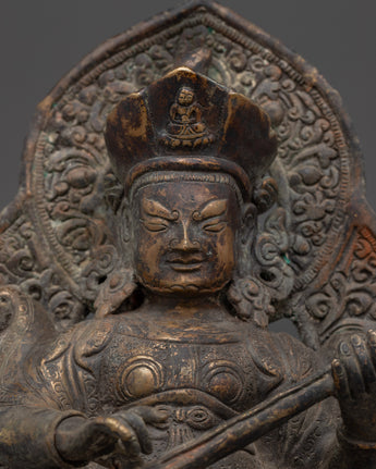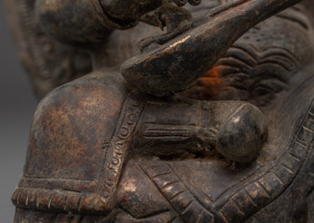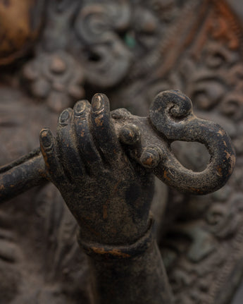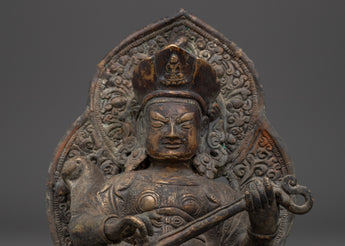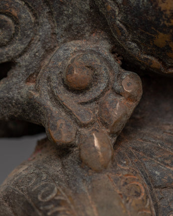 Expertly handcrafted with a copper body and antique finish, this Dhatarattha Statue showcases remarkable attention to detail, capturing the Guardian King’s warrior-like stance, regal armor, and symbolic emblems of authority. Every intricate element reflects the depth and mastery of Himalayan artistry, imbuing the statue with profound cultural significance and spiritual energy. Ideal for practitioners seeking protection, good fortune, and a tangible connection to Buddhist guardianship, this statue serves as both a sacred symbol and an exquisite piece of timeless craftsmanship. It elevates any altar, meditation space, or collection with powerful presence and meaning.