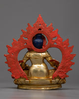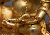 The Dzambhala Mantra Practice Statue represents riches and success. Handcrafted with devotion on a copper body and embellished with luxurious gold plating, this statue stands tall at 17.5 cm in height and 17 cm in breadth, exuding a sense of divine blessings. Engage in the sacred practice of mantra recitation in front of this stunning portrayal, allowing the fine intricacies to strengthen your connection to the Dzambhala's energy of wealth and success.