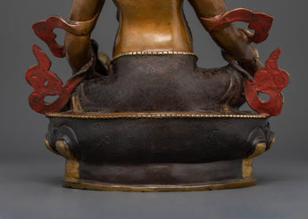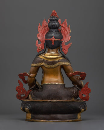 The Dzambhala Nepalese Handmade Statue is 31 cm tall and expertly carved from an oxidized copper body, giving it a distinct, antiqued appearance that showcases the textural intricacies of his intricate costume. This statue weighs 3.23 kg and is gilded in bright 24K gold, which contrasts well with the darker oxidized copper, accentuating the piece's exceptional craftsmanship.