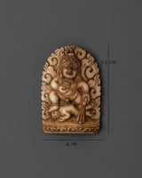 Each sculpture is expertly carved from bone, expressing the essence of White Dzambhala in stunning detail. He is pictured standing above a subdued person, which represents the overcoming of ignorance and attachment. His imposing physique is adorned with traditional Tibetan elements, such as beautifully carved ornaments and spiritual emblems. The texture and craftsmanship demonstrate the artisan's care and devotion, bringing this deity to life in a respectful yet expressive manner.