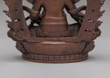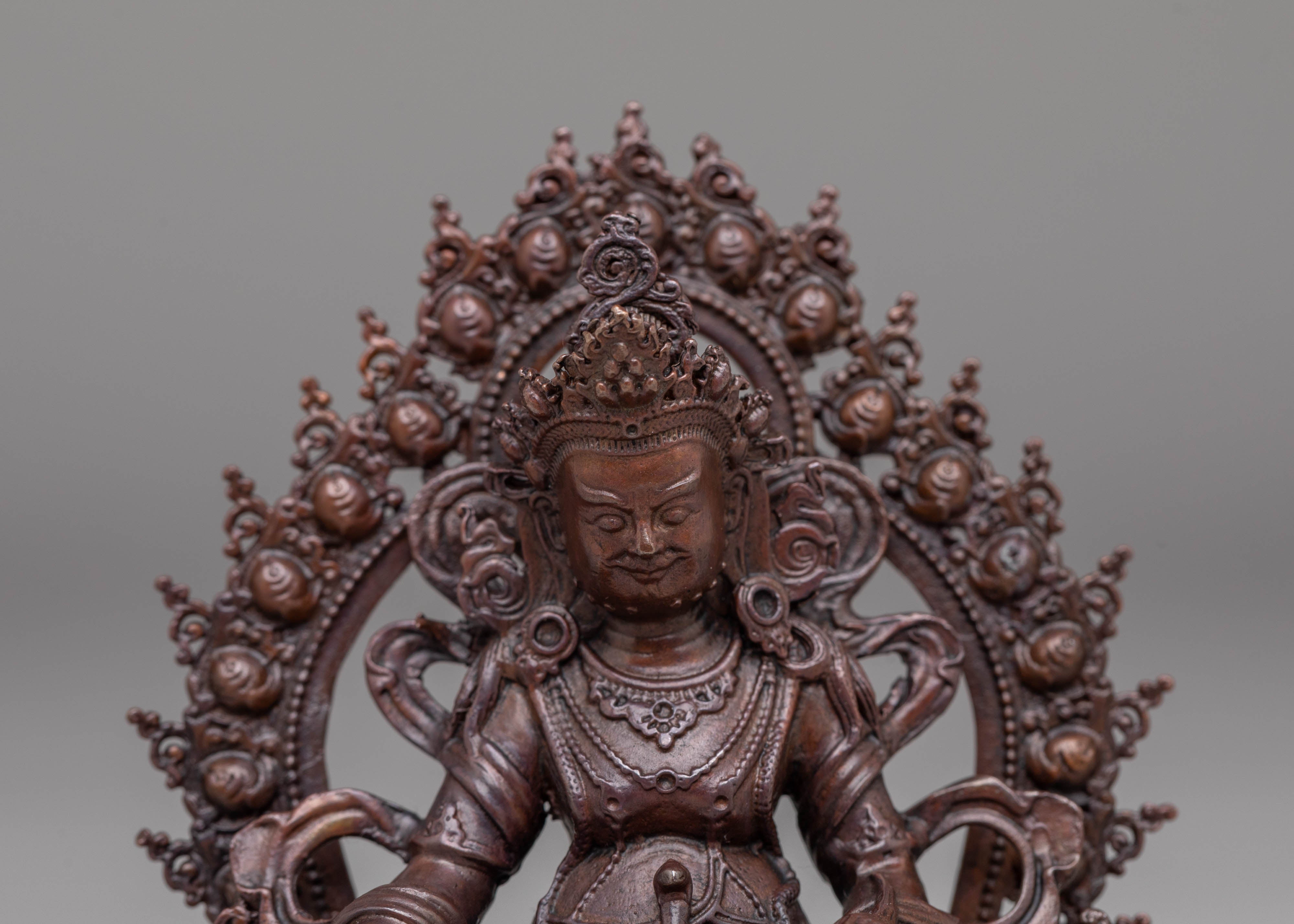 The Handmade Dzambhala Statue is a beautifully crafted representation of Dzambhala, the Tibetan deity associated with wealth, prosperity, and abundance. This intricate statue is made from high-quality oxidized copper, showcasing expert craftsmanship and attention to detail. Dzambhala is often depicted as a joyful deity, symbolizing the removal of obstacles to wealth and bringing blessings of financial success to those who seek his favor. The oxidized copper finish adds a timeless, aged look, making this statue both a spiritual and decorative piece for any space.