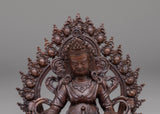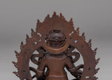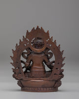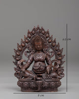 The design of the Dzambhala statue features the deity seated in a meditative posture, holding a mongoose that dispenses jewels, symbolizing the flow of prosperity. The rich, deep textures of the copper are accentuated by the oxidized finish, highlighting the fine details of the deity's robes, facial expressions, and accessories. The statue’s compact size makes it suitable for display on an altar, meditation space, or as part of a spiritual collection, bringing both beauty and blessings into your home or office.