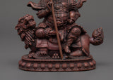 Namtoshe is sitting atop a roaring snow lion, holding a sword and a mongoose, representing both authority and the abolition of poverty. This piece is meticulously created, from the detailed armor to the decorative flame-like halo surrounding him. The copper finish gives it a rich, historic appearance, making it ideal for collectors and practitioners looking for a spiritual guardian and bringer of wealth.