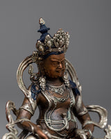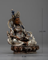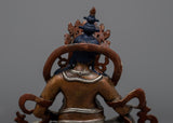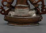 The Oxidized Dzambhala Machine Made Statue is a powerful depiction of the Tibetan Buddhist deity Dzambhala, who is venerated for his associations with wealth and success. This 9.5-cm-tall machine-made statue is expertly crafted, with oxidized copper body that displays fine details. It is adorned with a sparkling silver plating that gives it an air of mystery and beauty.