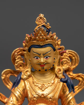 Dzambhala is a protective deity associated with wealth and prosperity. Many forms and traditions are associated with this wealthy deity, but he is usually depicted as yellow in color and holding a mongoose in his left hand. This statue has accurate traditional iconography and fine details.