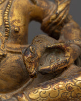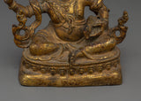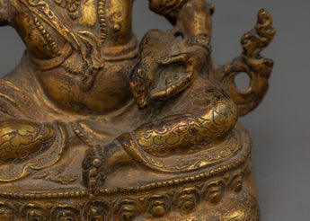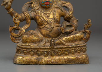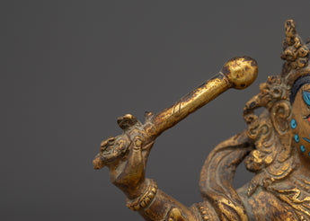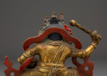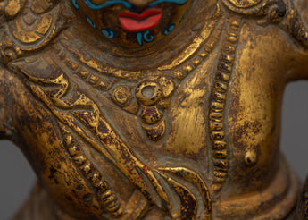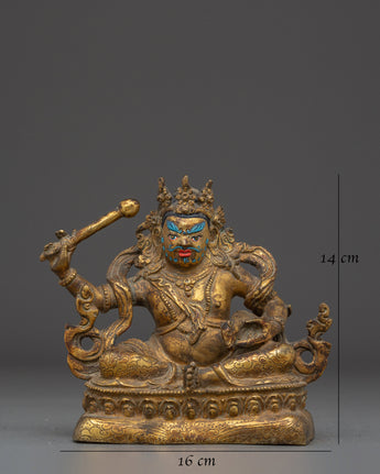 This beautiful Virulhaka statue, made of copper and gold-plated, will bring spiritual power and knowledge into your house. This statue is 14 cm tall and shows Virulhaka, the Heavenly King of the South. In Tibetan Buddhism, he is seen as the protector of the southern direction and the personification of knowledge and spiritual progress.
