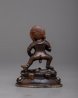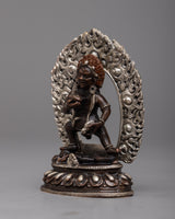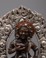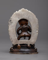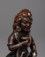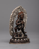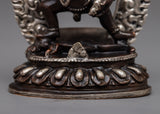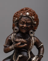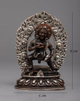 The Wealth Jambhala Statue will add elegance to any room. It is made of oxidized copper and exquisitely plated in silver. This statue, which stands just 8 centimeters tall, is a representation of Jambhala, the Buddhist deity of riches, who is said to be able to prevent financial difficulties and promote success. The deity's majestic form is emphasized by the intricate silver plating over the oxidized copper, which highlights every curve and feature with a dazzling sheen.