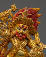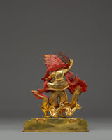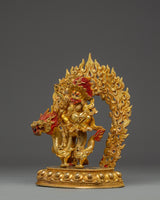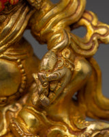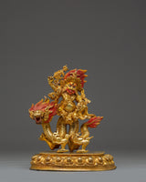Dzambhala is a protective deity associated with wealth and prosperity. Many forms and traditions are associated with this wealthy deity, but he is usually depicted as yellow in color and holding a mongoose in his left hand. This statue has accurate traditional iconography and fine details.