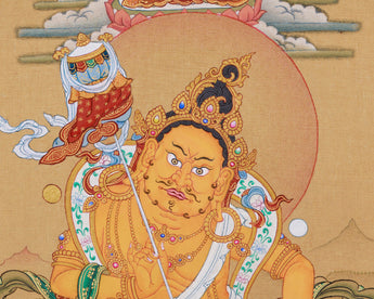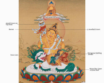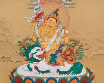 Namtoshe, also known as Vaishravana, is one of the Four Heavenly Kings and a highly respected Buddhist deity of wealth and protection. In this thangka, he sits gracefully on a roaring snow lion, a majestic symbol of fearless strength and pure spirit. He is holding a victory banner and a mongoose, both symbols of prosperity and generosity. Above him, Ratnasambhava, the Buddha of the Southern Direction, rests peacefully, representing calmness and the transformation of pride into wisdom. Mountains and offering symbols surround them—each part carefully painted to show their sacred connection and purpose.