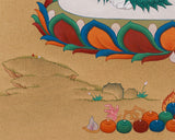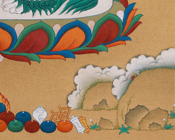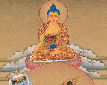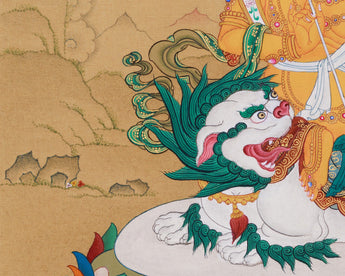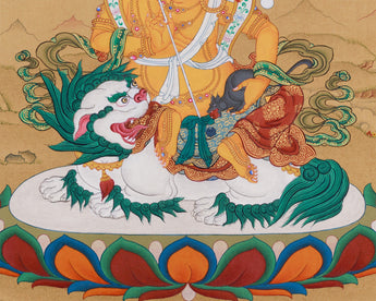 Experience the divine abundance of Namtoshe with Ratnasambhava, beautifully depicted on traditional cotton canvas. Using 24K gold and natural Lhasa stone pigments, each mineral hue is carefully layered by hand. The artwork showcases sacred geometry and the subtle balance characteristic of the Karma Gadri style. Its vibrant colors—from rich emerald greens to glowing golds—are created from crushed Himalayan stones, ensuring they stay vivid, natural, and spiritually meaningful. Golden accents highlight the divine aspects of the thangka, such as the ornaments, radiant halo, and majestic snow lion, inviting you to feel their warmth and depth.