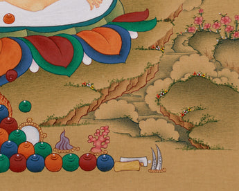 Behold the striking portrayal of Standing Black Dzambhala in this thangka, skillfully created alongside Ratnasambhava Buddha, with careful adherence to the traditional Karma Gadri style. Revered as the "Protector of Wealth," Black Dzambhala embodies spiritual and material abundance. Unlike other Dzambhala forms, his dark hue conveys his power to overcome obstacles, dispel negativity, and empower practitioners to attain spiritual wealth. The vibrant stone colors add depth and brilliance to his art, fostering a strong connection with viewers. At the same time, the 24K gold highlights create a sacred aura, amplifying the deity’s brightness and underscoring his divine nature as a protector and bestower of wealth.