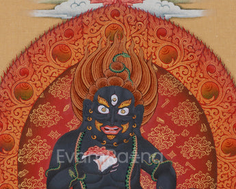 Black Dzambhala stands firmly, grasping a mongoose in his left hand, which, in mythological symbolism, endlessly dispenses jewels as a representation of generosity and the universe's endless bounty. In his right hand, he holds a skull cup filled with nectar, symbolizing the essence of enlightenment and the transformation of obstacles into opportunities. Above him is Ratnasambhava Buddha, who represents the wealth of spiritual knowledge. Ratnasambhava’s serene and peaceful presence balances the dynamic energy of Black Dzambhala, reminding viewers that true wealth arises from spiritual growth. The union of these two figures reinforces the idea that material wealth should be utilized for spiritual growth and advancement.