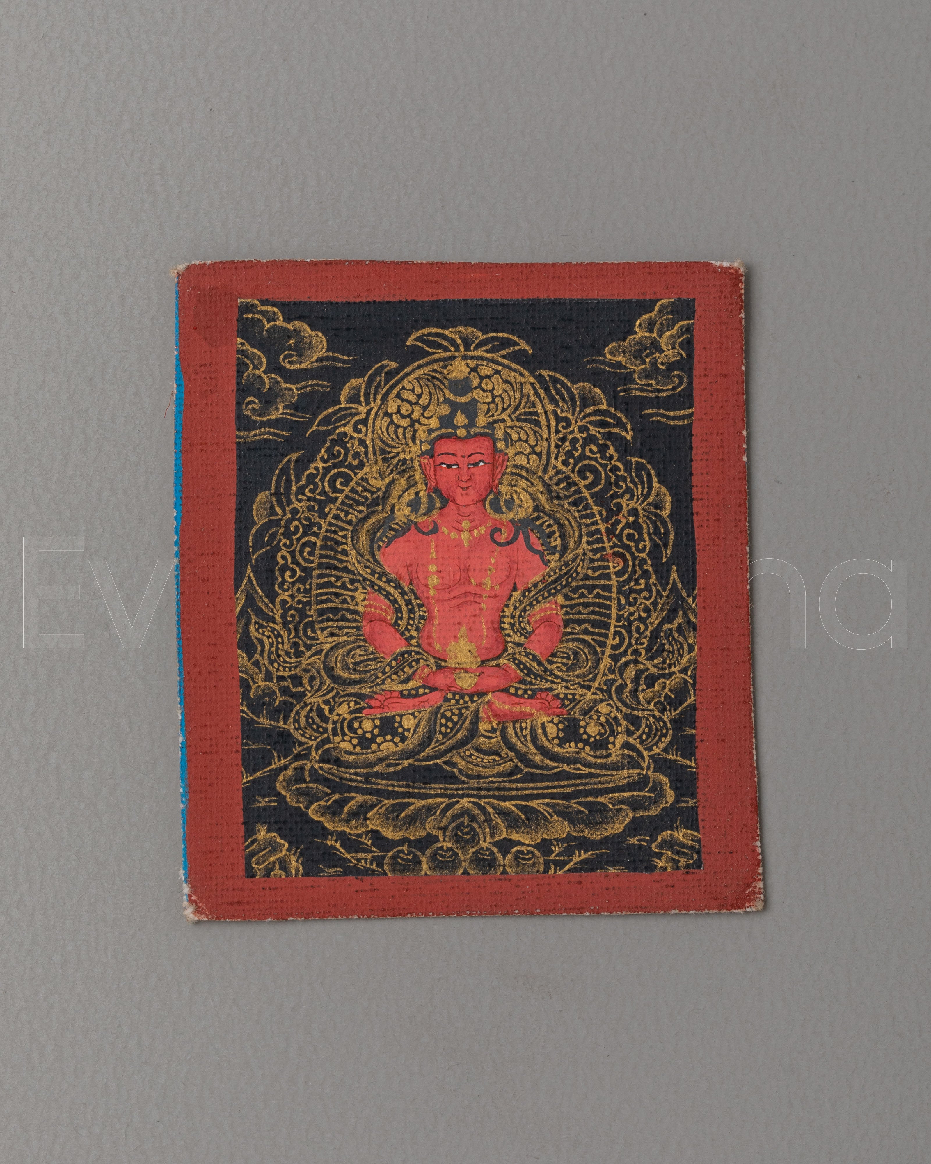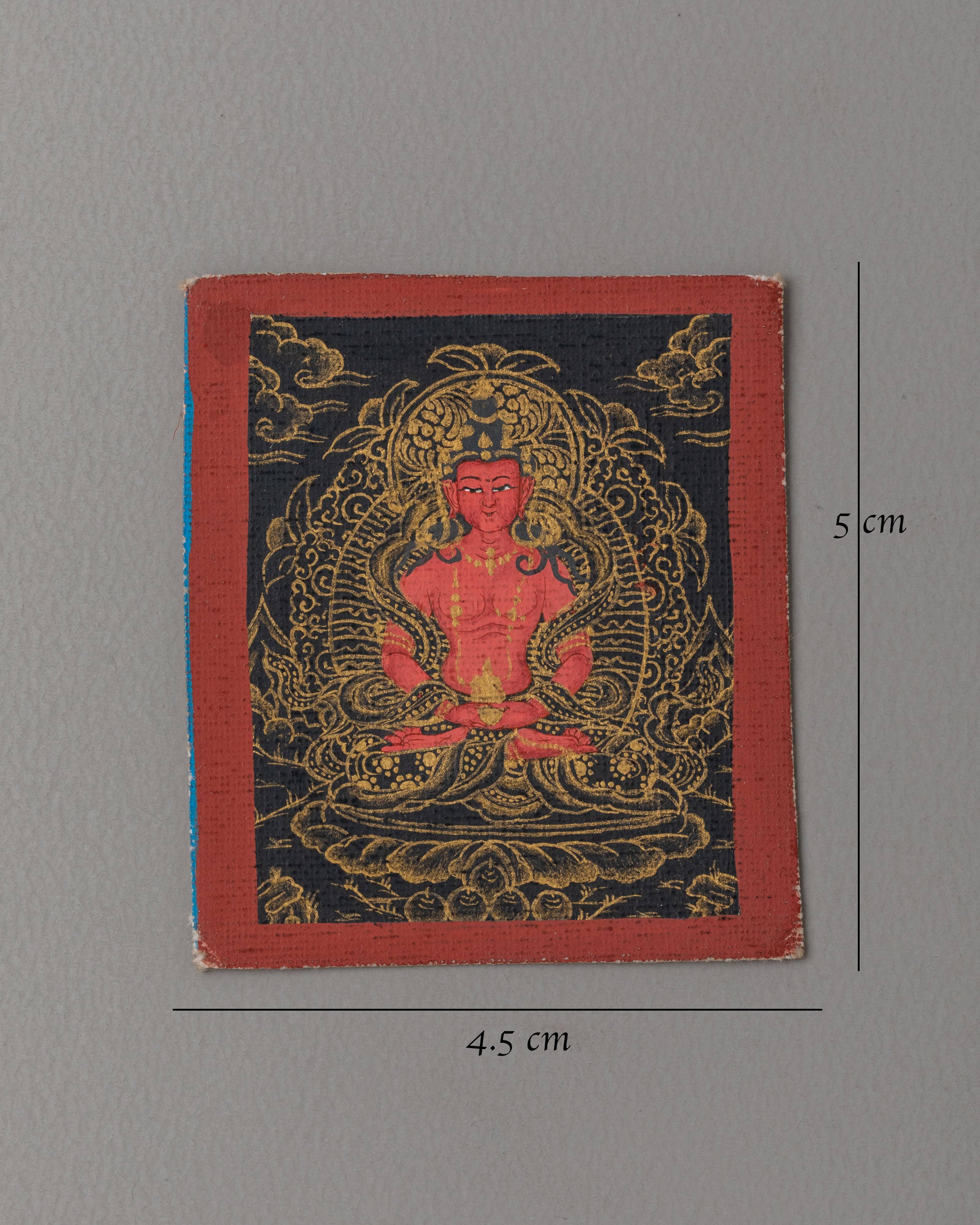 The Amitayus Thangka for Locket is an exquisite, hand-painted Tibetan art piece designed for those seeking longevity and spiritual blessings. Measuring just 5 cm in height and 4 cm in width, this beautiful thangka is created on cotton canvas and adorned with acrylic colors and 24K gold accents. It portrays Amitayus, the Buddha of Infinite Life, who is deeply revered in Buddhist tradition for his ability to grant longevity and immortality. This detailed piece makes an ideal spiritual amulet for anyone looking to carry the essence of life and well-being with them at all times.