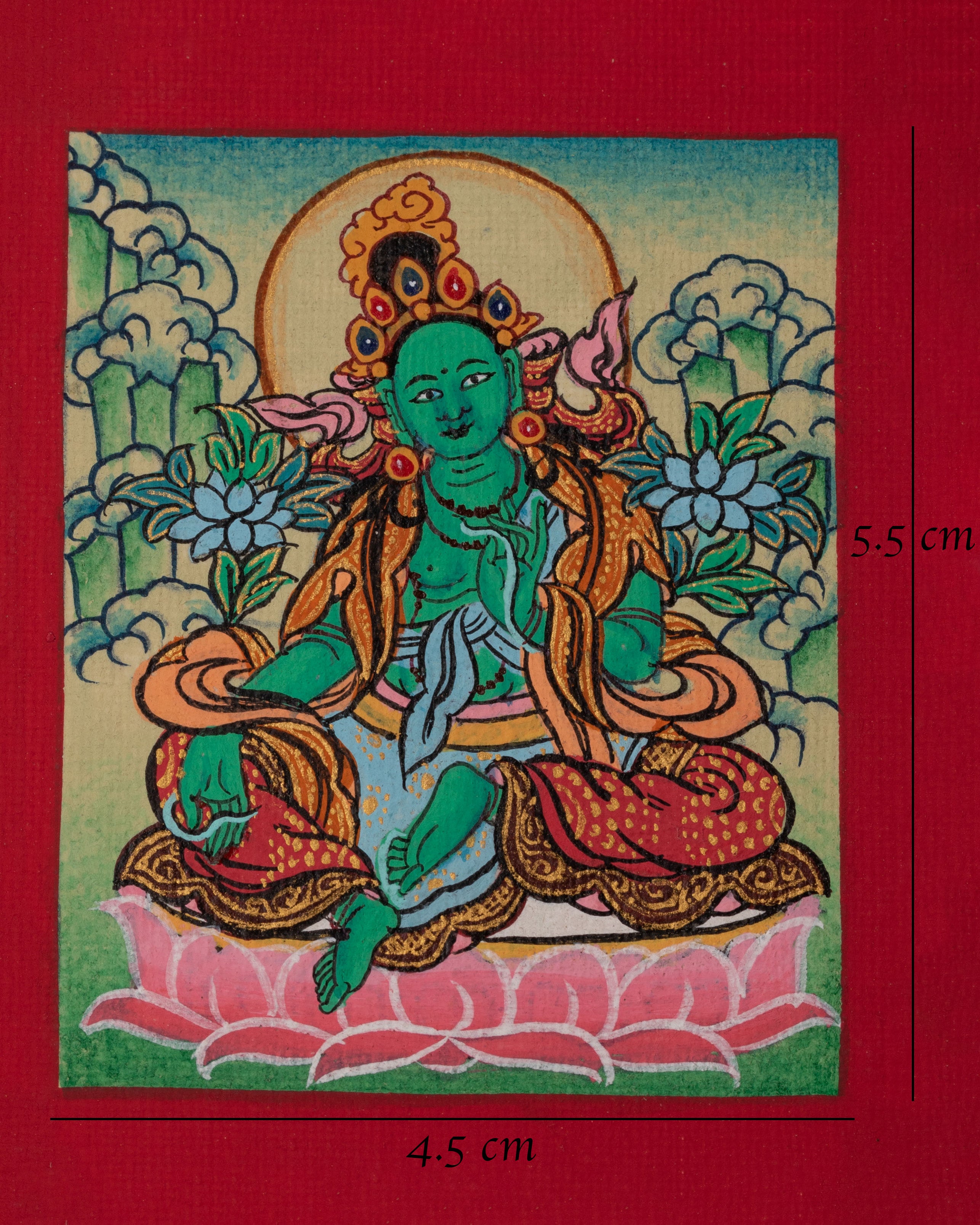 This Tibetan Green Tara Thangka for Locket is a finely handcrafted miniature artwork designed for spiritual protection and compassionate guidance. Measuring 5.5 cm in height and 4.5 cm in width, it is perfectly sized to be worn as a locket or kept close as a sacred amulet. Painted on cotton canvas with acrylics and finished with 24K gold gilding, the thangka combines exquisite artistry with lightweight durability for daily wear.
