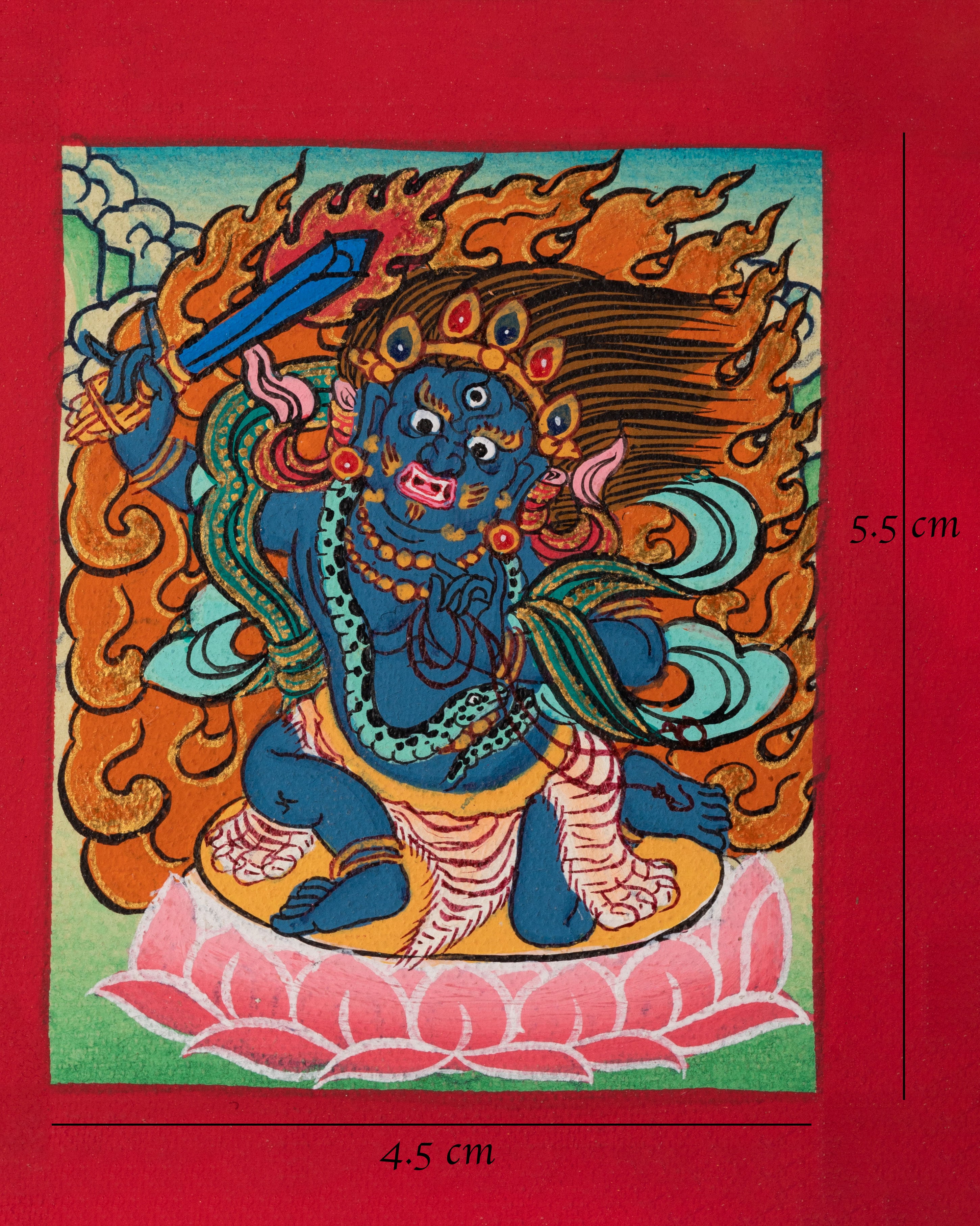 This traditional Achala thangka for a locket is a finely hand-painted miniature sacred artwork created on cotton canvas using classical Tibetan thangka techniques. The painting depicts Achala (also known as Acala), revered in Vajrayana Buddhism as a powerful protector who removes obstacles and dispels negativity. Rich acrylic pigments and refined 24K gold detailing enhance the sacred intensity of the image, making this miniature thangka suitable for devotional wear, meditation, or personal ritual practice.