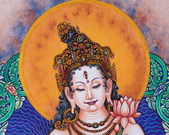 In traditional Newari pauba style, Mother Buddha's White Tara sits on Lotus, with three eyes on the face, hands, and feet. Our artist depicts Tara's elegance amidst enchanting flora. You can use this print for various purposes, such as meditation, Buddhist rituals, and even home décor. This pauba print of White Tara has accurate traditional iconography with minute, fine details and will be a perfect gift to a devotee like you from Nepal.